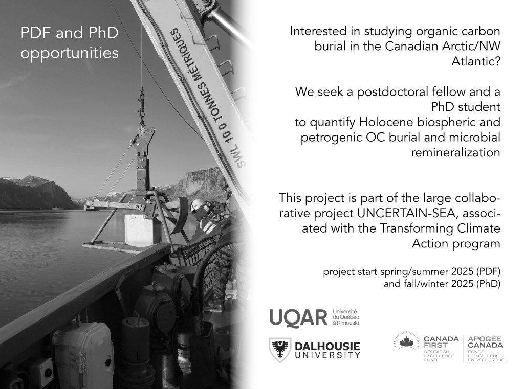 Both projects will be carried out in collaboration with Dalhousie University and are embedded in the CFREF-funded Transforming Climate Action program, which comes with many additional funding, international exchange, and professional development opportunities. Funding for the PDF position is available for 2 years with potential for extension; candidates with a solid background in organic geochemical methods (especially with preparative GC and LC-MS/MS) are strongly encouraged to apply. Funding for the PhD position is available for 3 years.